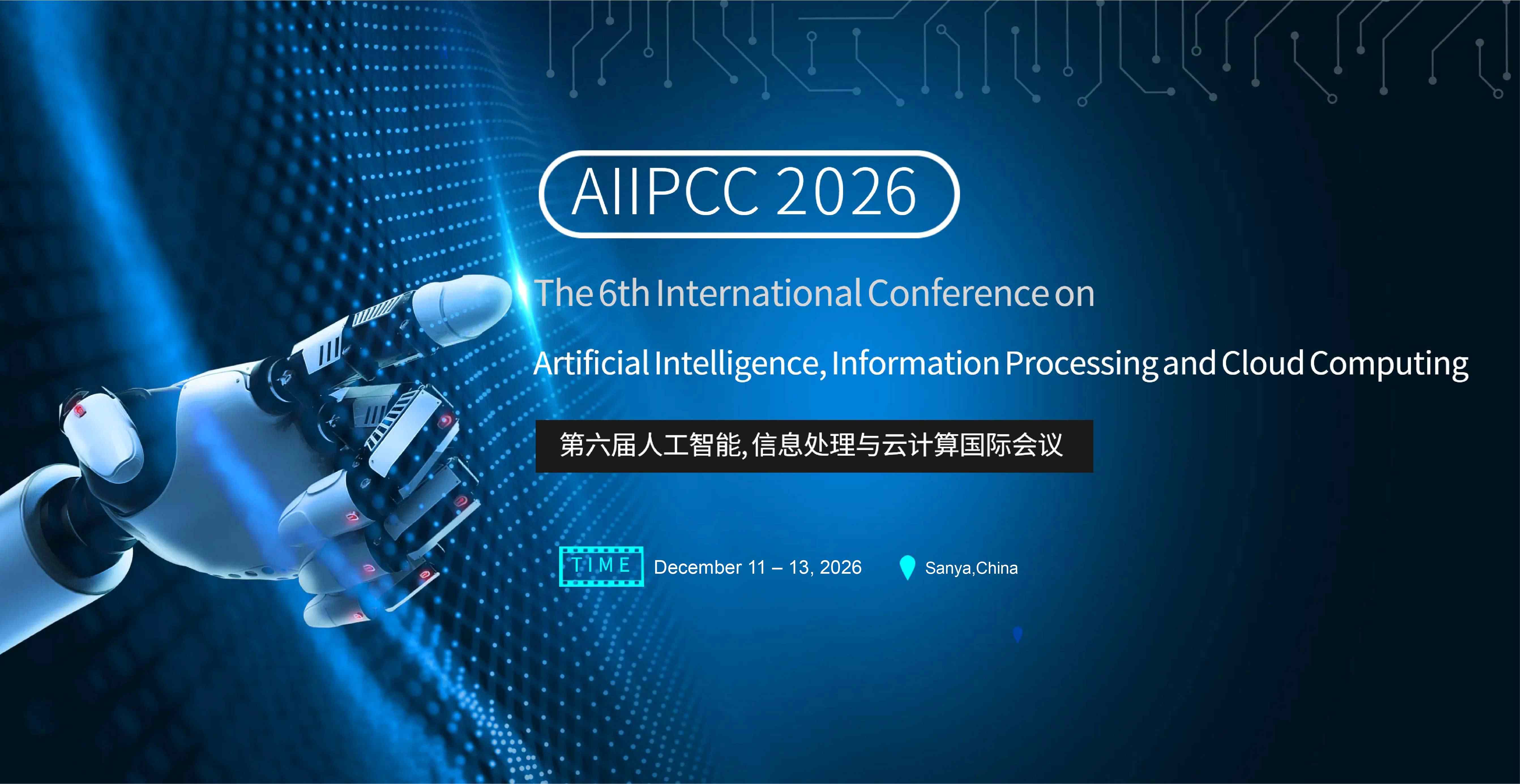 The 6th International Conference on Artificial Intelligence, Information Processing and Cloud Computing (AIIPCC 2026) will be held in Sanya,China during December 11–13, 2026. On behalf of the organizing committee, we would like to cordially invite experts and participants from academia and industry to participate in AIIPCC 2026!